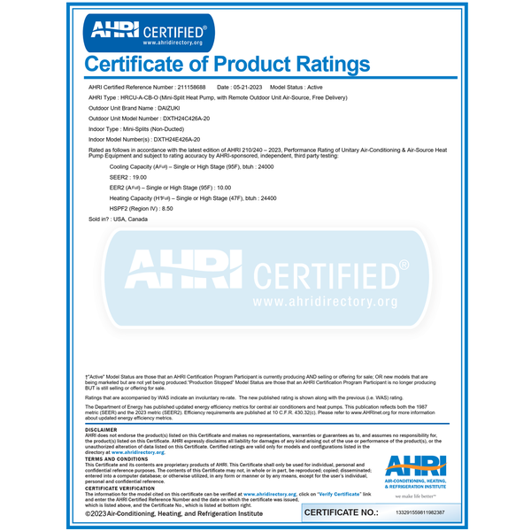 - Certifications: AHRI, ETL