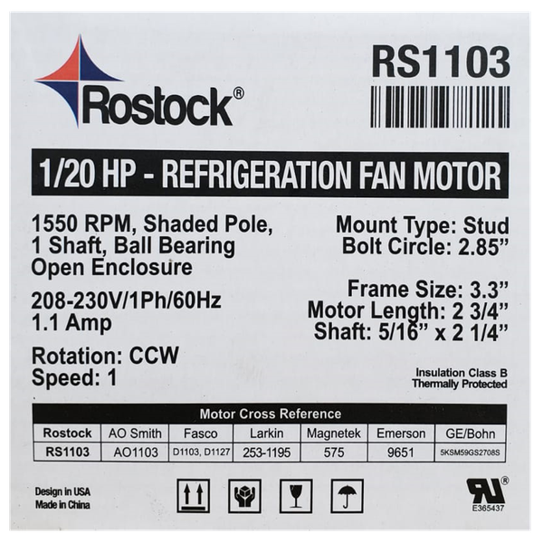 ROSTOCK - SHADE POLE FAN MOTOR 1/20HP 230V 50/60HZ 1550 RPM CCW SHAFT 5/16" BALL BEARING