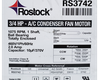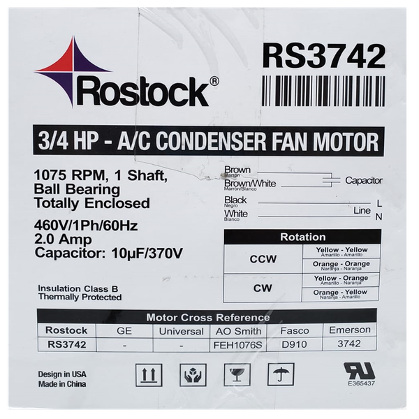 Rostock - Single Shaft A/C Condenser Fan Motor (5) 3/4 Hp 440-460V 60Hz 1075Rpm 1 Spd Cw/Ccw Shaft 1/2" Ball Bearing Frame 48 Ul Approved ***Pl=90